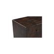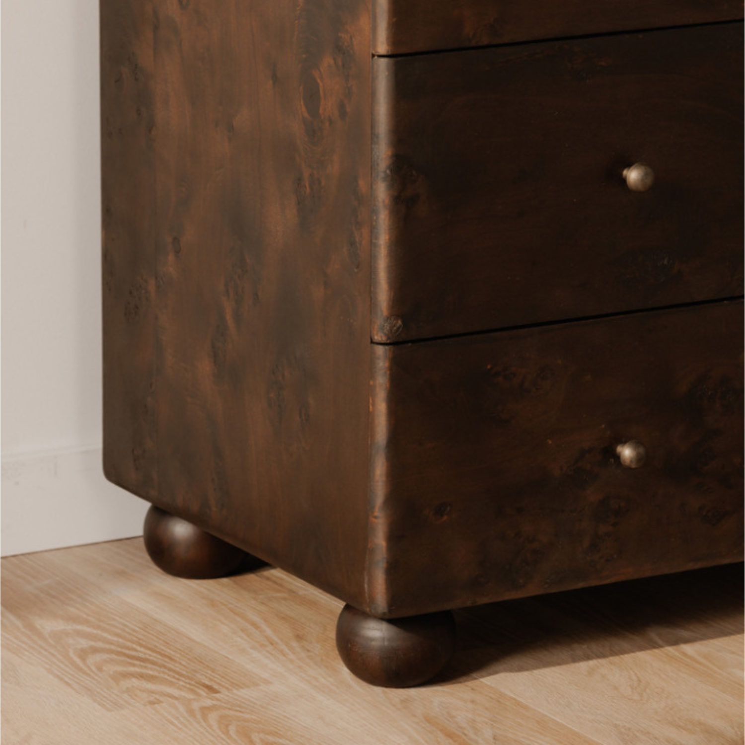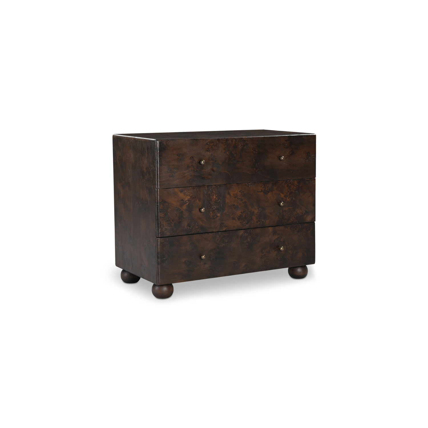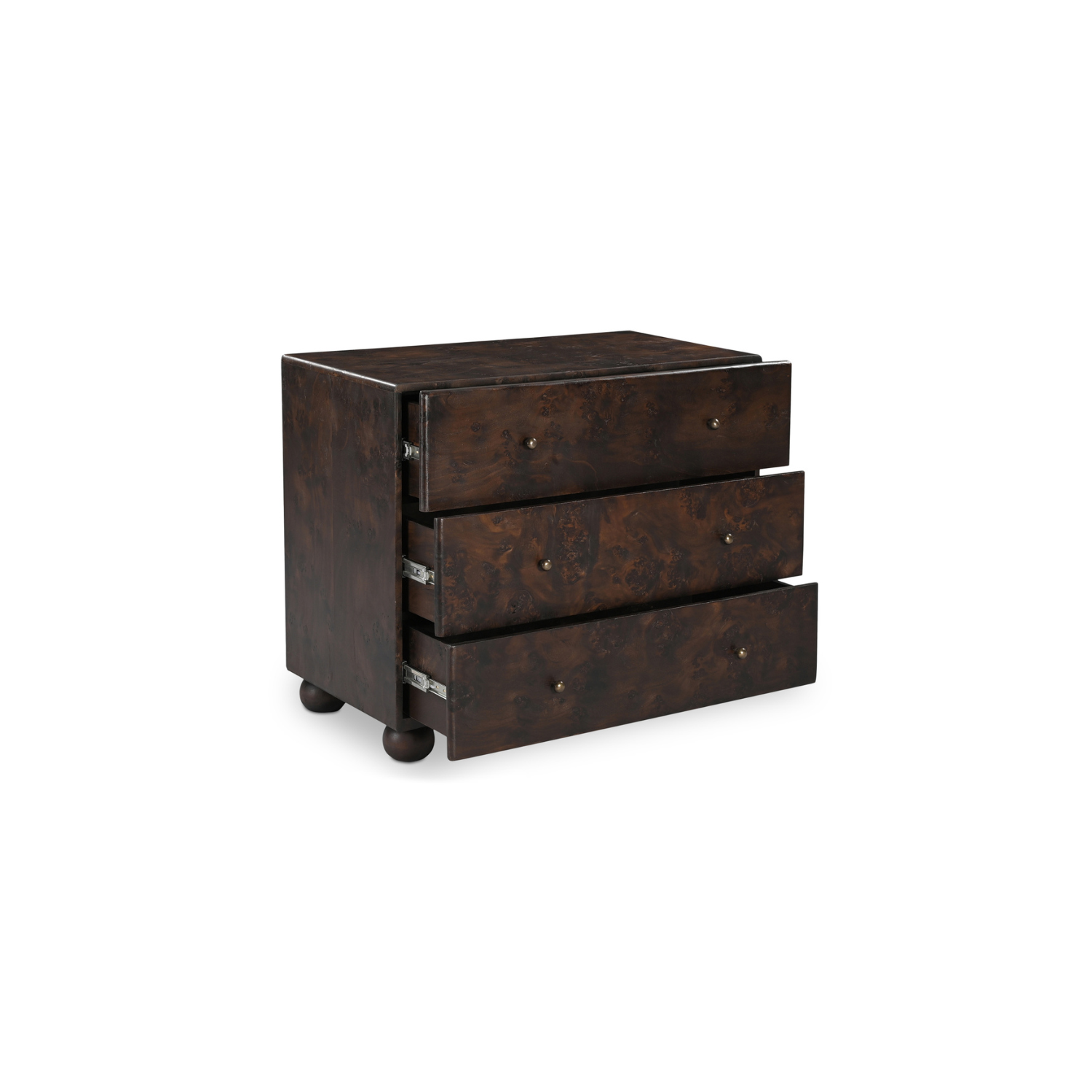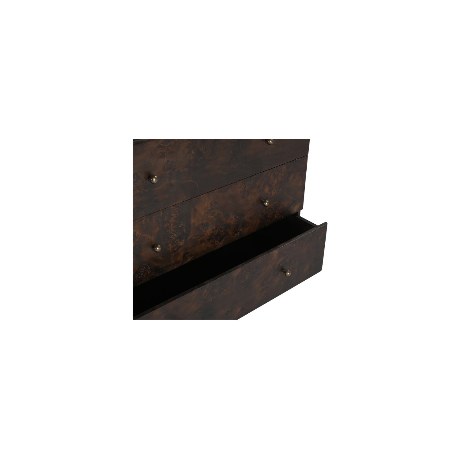 - Materials: Burl Veneer over MDF Structure, Acacia Wood Legs, Brass Handle